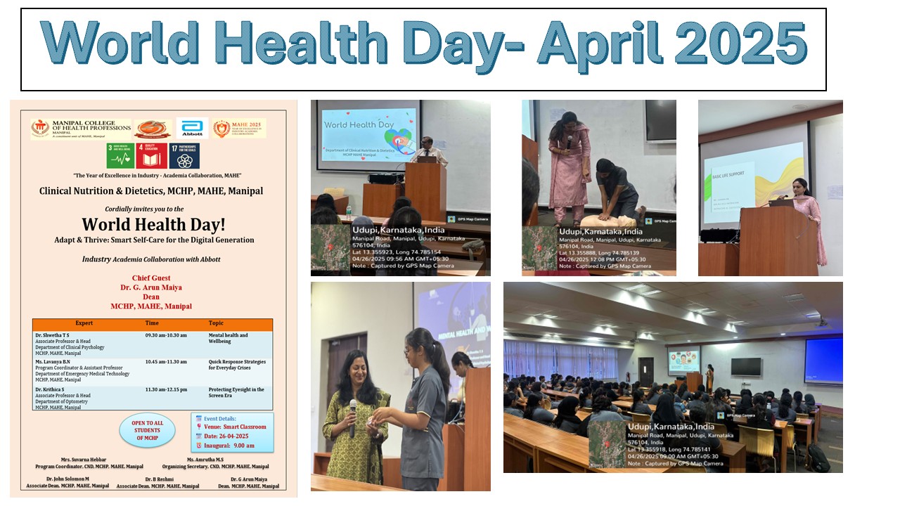 In celebration of World Health Day, the Department of Clinical Nutrition and Dietetics at MCHP, MAHE, Manipal organized an insightful event themed “Adapt and Thrive: Smart Self-Care for the Digital Generation.” on 26th April,2025 at Smart Classroom, MCHP, MAHE, Manipal