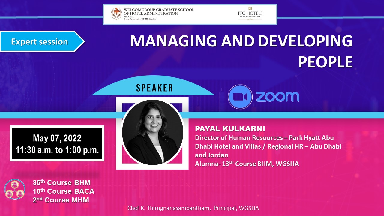 We are happy to have our alumna from 13th Course (BHM) Ms. Payal Kulkarni Director of Human Resources – Park Hyatt Abu Dhabi Hotel and Villas / Regional HR – Abu Dhabi and Jordan to conduct a webinar on Managing and Developing People on 7th May 2022 between 11.30 a.m. and 1.00 p.m.