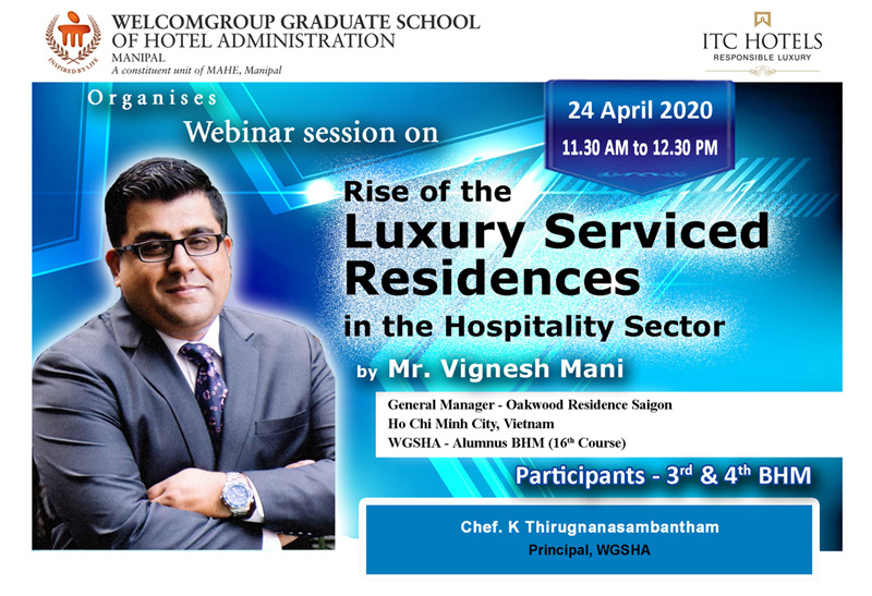 WGSHA organises a webinar with Mr. Vignesh Mani,  General   Manager, Oakwood Residence, Saigon, Ho Chi Minh City, Vietnam,  is an alumnus of the BHM 16th course and brings with him to the session a rich experience of over  17 years in  Hospitality Sector.