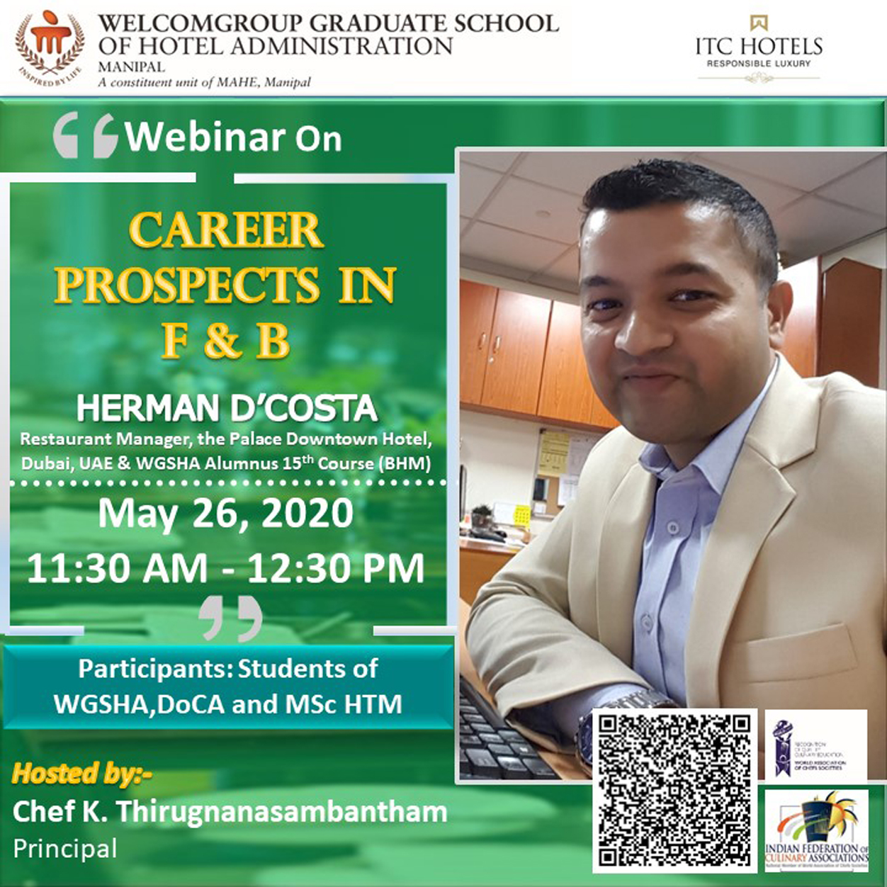 Webinar on career prospects in F & B by WGSHA Alumnus Mr. Herman D' Costa